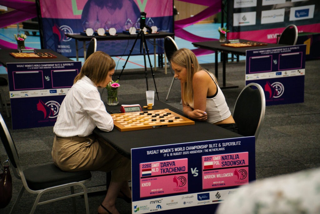 In Hoogeveen zijn Natalia Sadowska en Darya Tkachenko wereldkampioen geworden. In de finale van het Blitz-toernooi kwam sadowska in een onderlinge strijd met Tkachenko tekort voor de titel (4-2 winst voor Tkachenko), maar zij pakte een dag later wel de titel in het Superblitz door in de finale af te rekenen met Lisa Scholtens. Alle uitslagen, foto’s (waaronder onderstaande foto) en filmpjes vind je op de toernooisite https://wkvblitz.kndb.nl/